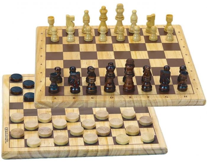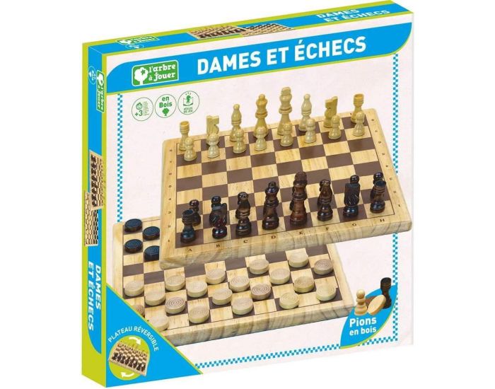 Plateau de jeu réversible en bois et pions en bois.
