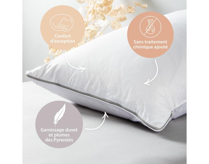 Cet oreiller avec garnissage en petites plumes et duvet de canard est ultra moelleux et réconfortant, il offre un confort unique et 100% naturel.