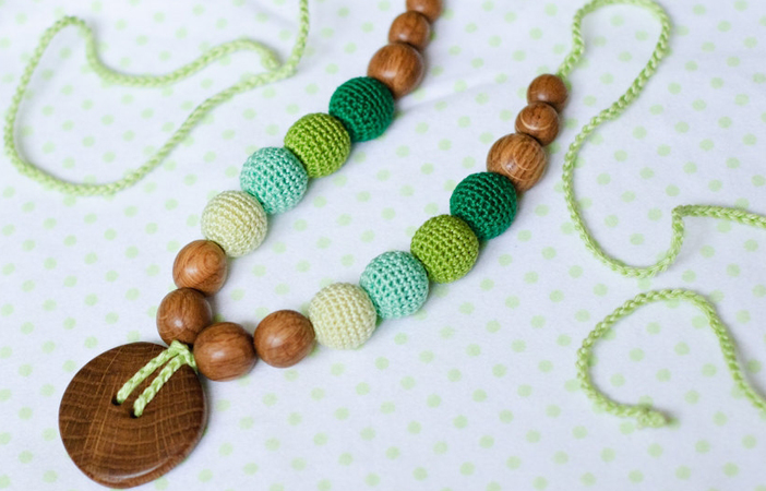 Ce collier sera alors d'une grande utilité puisque bébé aura à sa portée de quoi explorer, manipuler, gratouiller, il sera attiré par les couleurs vives et les différentes textures, entre le touché lisse du bois et celui des perles crochetées. Il développera sa motricité fine et son sens de l'observation.