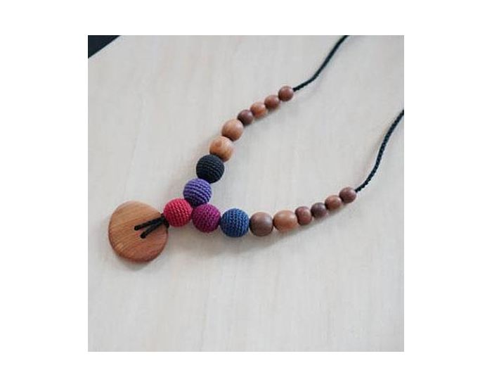 Le collier est composé de perles recouvertes en crochet et de perles de bois de Chêne.