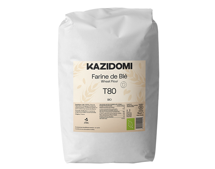 La Farine Blé Semi-Complète T80 de Kazidomi est riche en fibres. Elle convient pour la réalisation de pain de campagne, pain aux céréales et parfois en pâtisserie.