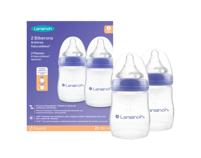 Le Lot de 2 Biberons PP Natural Wave Lansinoh et ses tétines péristaltique NaturalWave sont spécialement conçus pour les bébés nourris au sein.