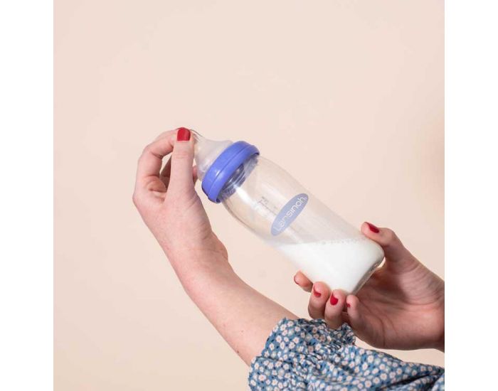 Installez-vous confortablement, veillez à ce que la tétine soit suffisamment inclinée pour être pleine. De petites bulles apparaissent à la surface au fur et à mesure que bébé boit, c'est le signe que le flux est régulier et que le bébé n'avale pas d'air.