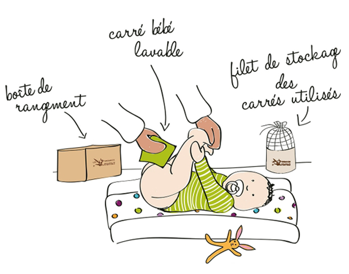 L'utilisation de la boîte en bois PEFC et du filet de lavage évite toute contrainte ou machine supplémentaire. Utilisez les carrés et gants de change avec votre produit habituel et placez les dans le filet une fois utilisés. Mettez le filet directement dans la machine lorsqu'il est plein... lavez et réutilisez !