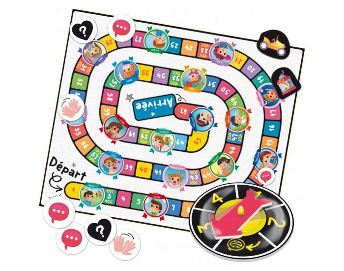 Avec un plateau de jeu, une roue avec flèche, 22 jetons et 4 marque-places.