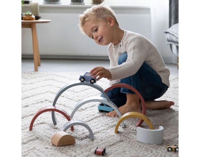 Il peut empiler les arcs ou utiliser son imagination pour réaliser toutes sortes de créations. Comme un tunnel ferroviaire, une petite maison pour poupées ou des ponts pour les voitures. Les possibilités sont infinies !