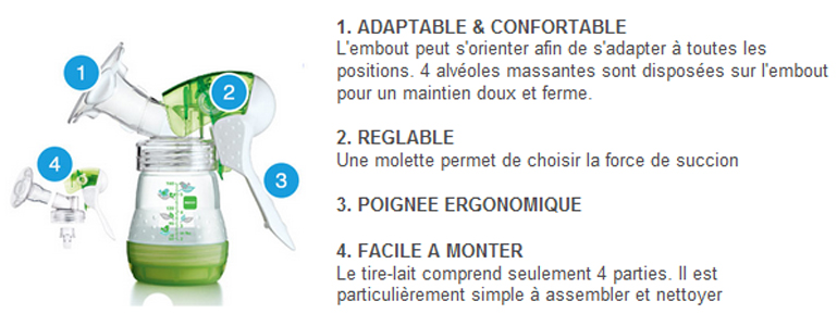 Conjuguant à la perfection fonctionnalité et design, le Tire-Lait Manuel MAM a été mis au point avec un goût du détail prononcé. Il s'adapte aux besoins individuels des utilisatrices.