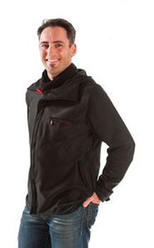 L'empiècement de portage est similaire à la version féminine et peut s'installer devant ou dans le dos. L'empiècement s'enlève facilement et la veste peut être portée sans bébé. La veste dispose d'une capuche pour le porteur et pour bébé. Les capuches sont ajustables et peuvent être enroulées et cachées quand vous n'en avez pas besoin.
