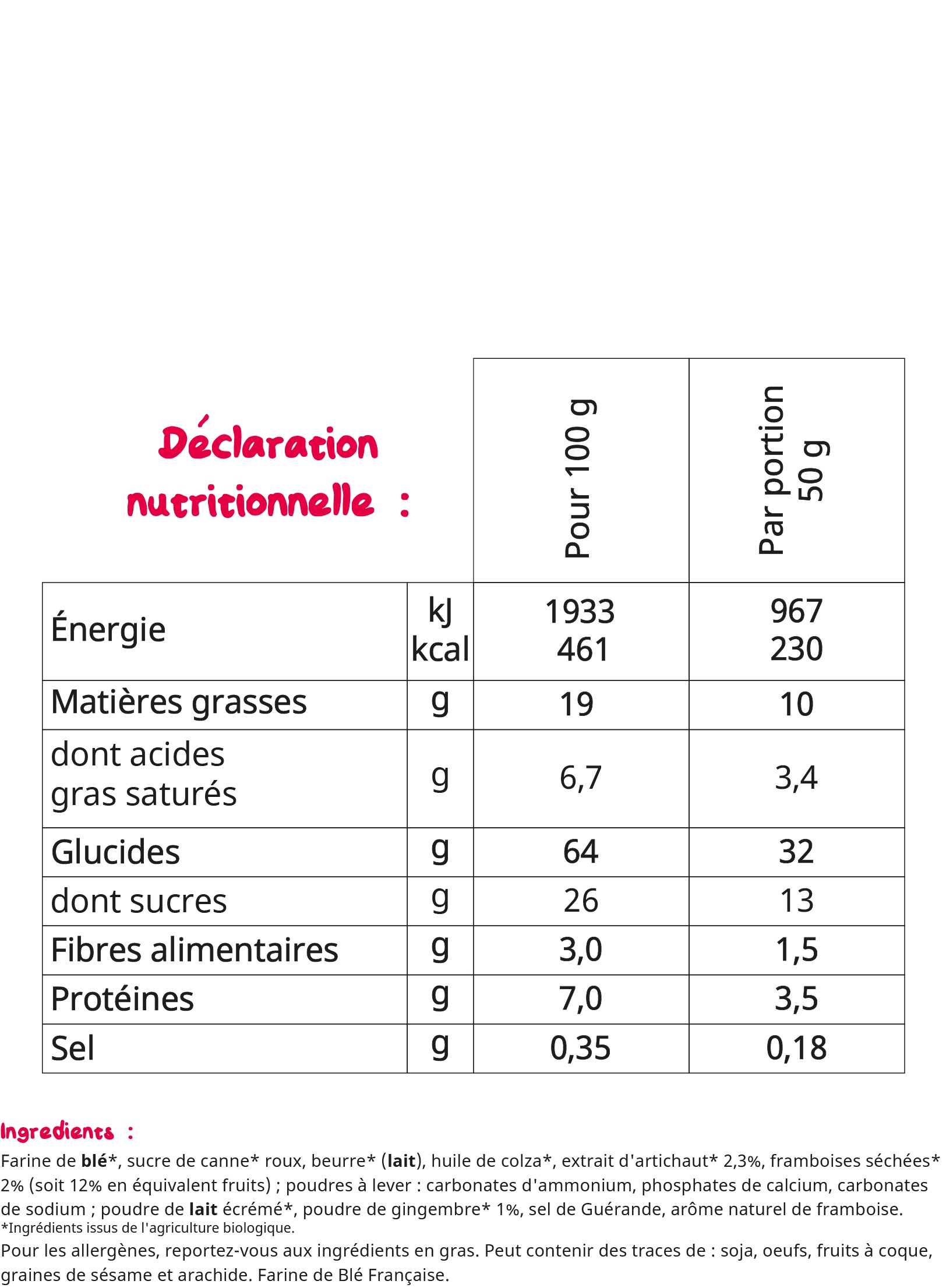 Dans mes biscuits matilia® Anti-Nausée BIO, il y a : Du gingembre BIO qui soulage les désagréments digestifs - Des morceaux de Framboise BIO - Des fibres