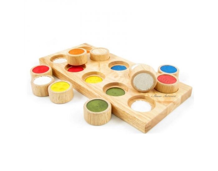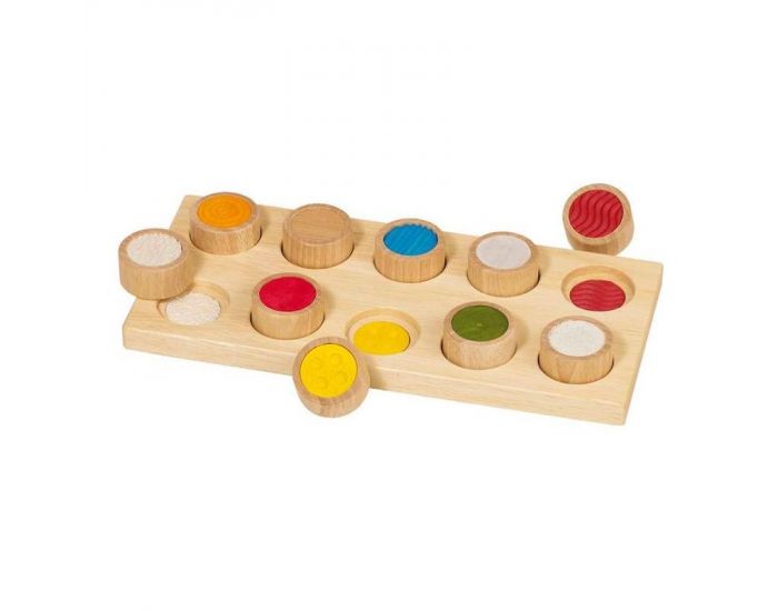 Un magnifique jeu de mémory, avec 10 textures ou surfaces différentes que l'enfant doit reconnaitre et associer avec les 10 cavités.