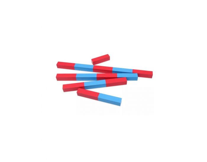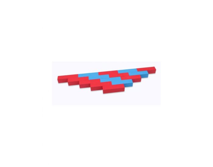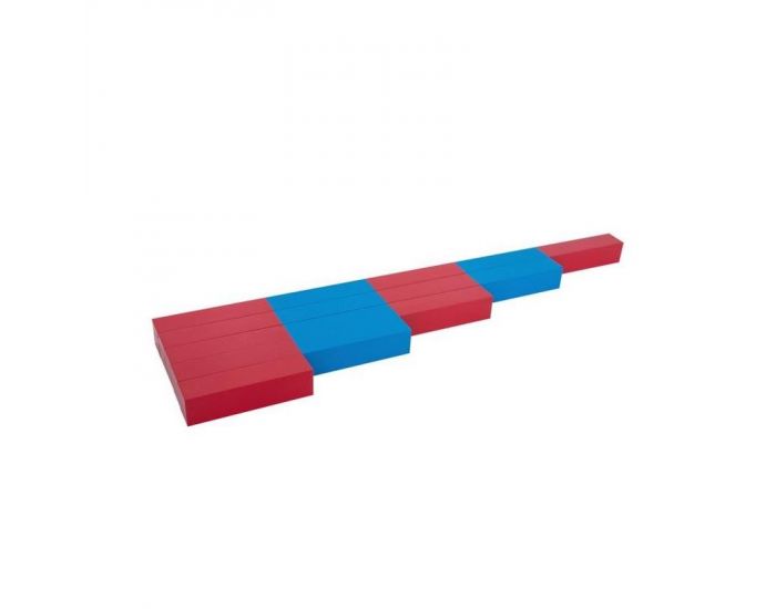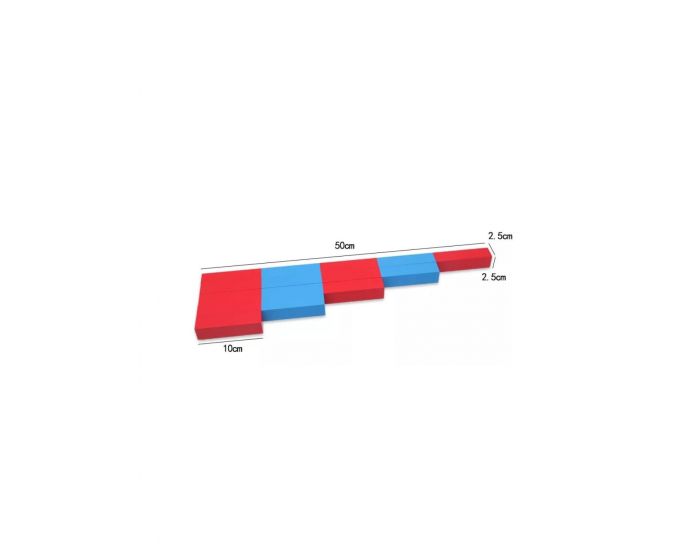 Le lot est composé de 5 barres en bois, peintes par segments de 10 cm, alternativement en rouge et bleu, qui vont de 10 cm (pour la barre de 1) à 50 cm (pour la barre de 5).