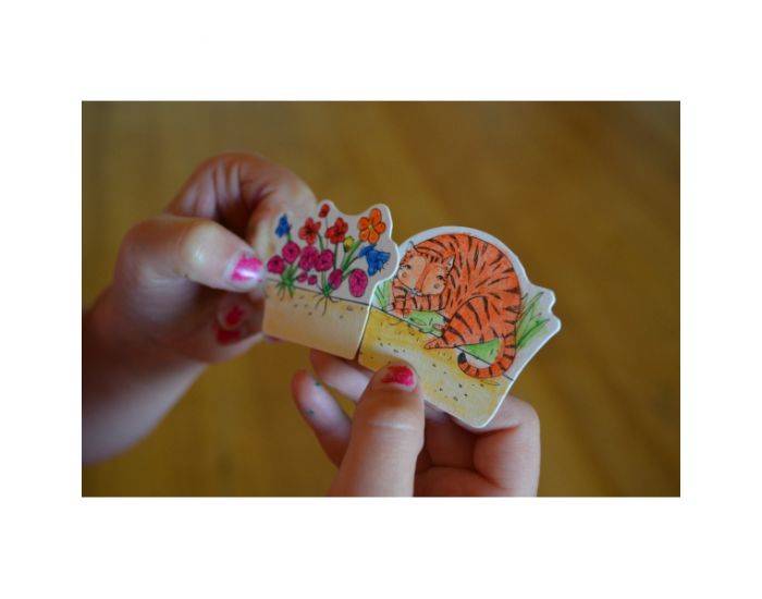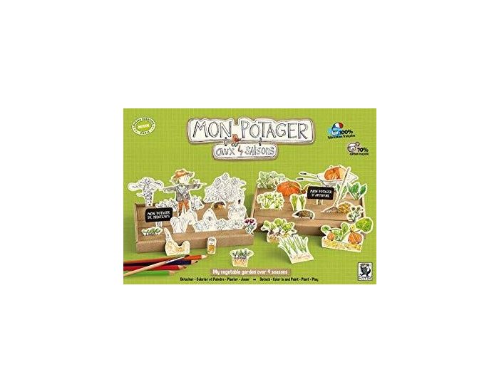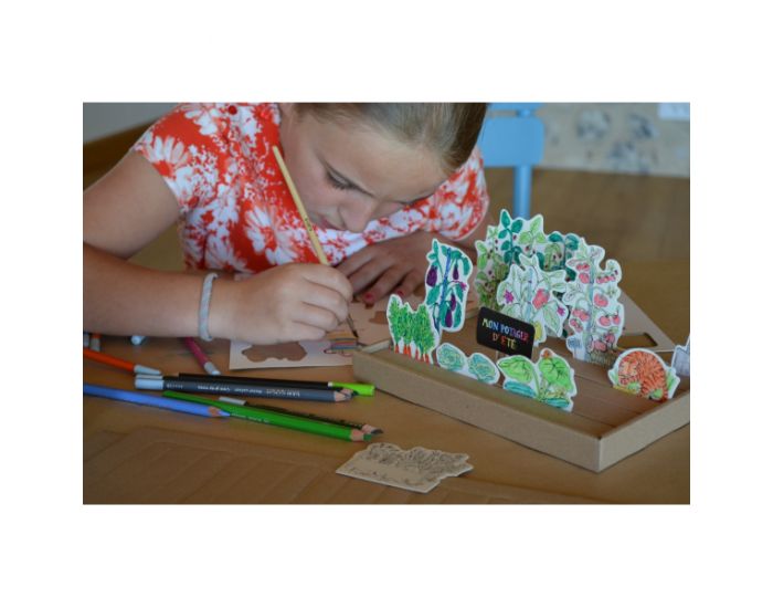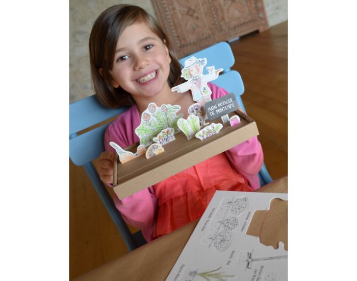 L’enfant détache puis met en couleur légumes et fleurs avant de les planter dans son potager sans oublier les petits animaux, les épouvantails et les outils du jardinier.