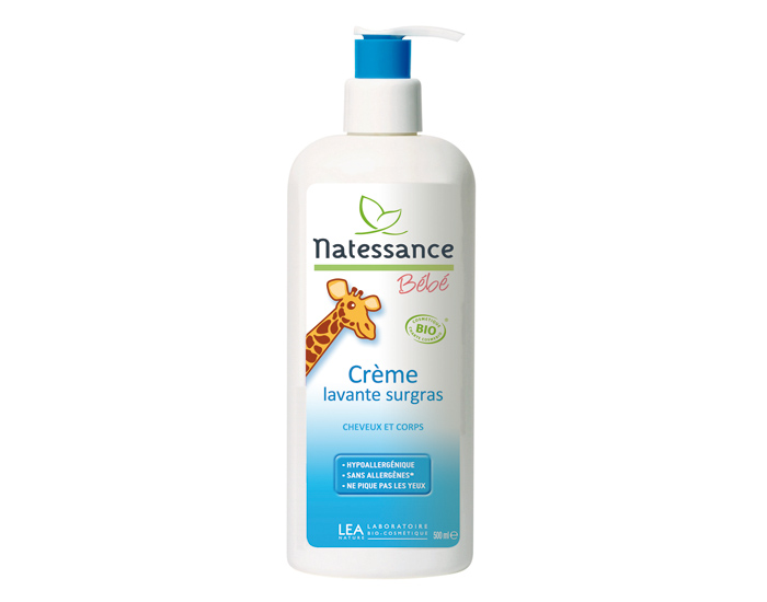 La Crème Lavante Surgras Natessance certifiée biologique, hypoallergénique et sans savon, ne pique pas les yeux et nettoie en douceur le corps et les cheveux de Bébé. Particulièrement adaptée pour les peaux sèches, elle se rinçe après utilisation.