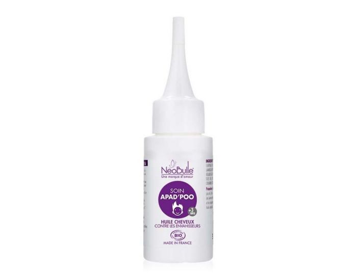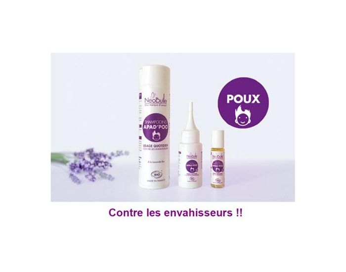 Ah2ad'Poo spray un soin curatif !Elimine les petites bêtes qui envahissent la chevelure de nos écoliers.Ce soin complet vient à bout des poux et des lentes sans aucun insecticide. Naturel, il n'irrite pas le cuir chevelu. Utilisation :Appliquer généreusement le spray sur l'ensemble du cuir chevelu. Laisser agir 2 heures (préférable une nuit) sur une chevelure entourée d'un film ou mieux d'un bonnet de bain. Passer un peigne fin et faire un shampoing. Appliquer ce soin le lendemain et renouveler 7 jours plus tard.Durée de conservation : minimum 2 ans (date de fabrication indiquée sur le produit comme suit : exemple 1209UR3 = septembre 2012)Durée de conservation optimale après ouverture : 6 mois. Composition :HV : carthame.H.E : lavande fine, tee tree, romarin cinéole, myrte, cèdre de l'Atlas. Contenace :Flacon spray de 50ml. La qualité des produits Néobulle :100% biologique.Naturels : sans composant de synthèse.Composition épurée et efficace : sans artifice.Les huiles essentielles sont choisies et dosées pour les plus fragiles.Testés pour les peaux sensibles (non testé sur les animaux). Fabricant :Néobulle (france)...