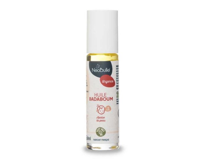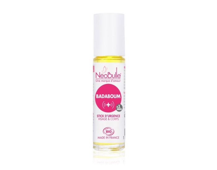 Badaboum stick d'urgence qui diminue les douleurs !Le stick d'urgence Badaboum de Néobulle évite les douleurs liées à la comh2ression des tissus. Son efficacité est remarquable grâce notamment aux propriétés de l'hélychryse !Appliquer immédiatement après le coup, il évite l'apparition de l'hématome. Il diminue les ecchymoses déjà présentes très rapidement.Les petits téméraires adorent son nom. Pour eux, mieux vaut avoir toujours ce qu'il faut sous la main... justement ce stick se glisse partout... et ne rend pas service qu'aux enfants ! Utilisation :Pour toute la famille, application directe sur la zone de l'impact 3 à 5 fois dans la journée. Ne pas appliquer sur une plaie. Durée de conservation : minimum 2 ans (date de fabrication indiquée sur le produit comme suit : exemple 1209UR3 = septembre 2012)Durée de conservation optimale après ouverture : 6 mois. Composition :OLEA EUROPAEA FRUIT OIL, HELIANTHUS ANNUUS SEED OIL, CUPRESSUS SEMPERVIRENS LEAF OIL, LAVANDULA ANGUSTIFOLIA OIL, HELICHRYSUM ITALICUM FLOWER OIL, ARNICA MONTANA FLOWER EXTRACT, BENZYL CINNAMATE, COUMARIN, GERANIOL, LIMONENE, LINALOOL.100% des ingrédients sont issus de l'Agriculture Biologique. Contenance :Roll-on de 9ml. La qualité des produits Néobulle :100% biologique.Naturels : sans composant de synthèse.Composition épurée et efficace : sans artifice .Les huiles essentielles sont choisies et dosées pour les plus fragiles.Testés pour les peaux sensibles (non testé sur les animaux). Fabricant :Néobulle (france)...