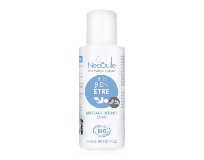 Une huile de massage relaxante h2our le corps dès la naissance !Huile de massage pour un pur moment de douceur. Cette huile détente est naturellement nourrissante.Elle sera particulièrement efficace sur un peau encore humide après le bain.Elle a un effet relaxant grâce notamment à la lavande fine et à la camomille.Dès la naissanceFlacon 100ml100% des ingrédients sont issus de l'Agriculture BiologiqueLabel Cosmébio.Utilisation :Eviter le contact avec les yeux et les muqueuses.En cas de contact, rincer avec une huile végétale.Durée de conservation : minimum 2 ans (date de fabrication indiquée sur le produit comme suit : exemple 1209UR3 = septembre 2012)Durée de conservation optimale après ouverture : 6 mois.Composition :PRUNUS ARMENIACA KERNEL OIL, HELIANTHUS ANNUUS SEED OIL, CARTHAMUS TINCTORIUS SEED OIL, LAVANDULA ANGUSTIFOLIA OIL, CITRUS AURANTIUM AMARA LEAF/TWIG OIL, ANTHEMIS NOBILIS FLOWER OIL, CINNAMOMUM CAMPHORA LEAF OIL, CITRUS LIMON PEEL OIL, LINALOOL, LIMONENE, GERANIOL, CITRAL.100% des ingrédients sont issus de l'Agriculture Biologique.Contenance :Flacon 100ml.La qualité des produits Néobulle :100% biologique.Naturels : sans composant de synthèse.Composition épurée et efficace : sans artifice .Les huiles essentielles sont choisies et dosées pour les plus fragiles.Testés pour les peaux sensibles (non testé sur les animaux).Fabricant :Néobulle - Fabriqué en France....