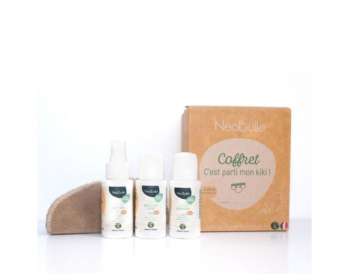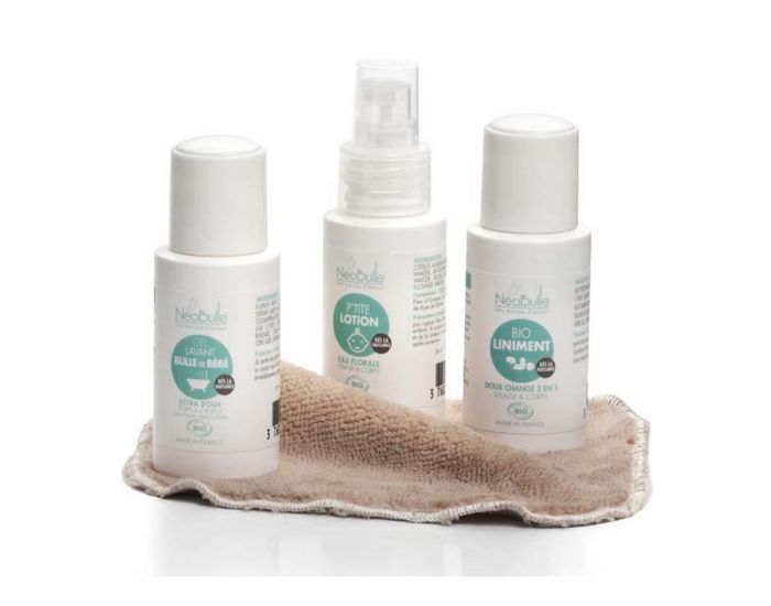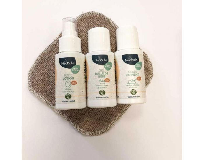C'est h2arti mon Kiki ... Le nécessaire de voyage pour bébé baroudeur !Une toilette rapide, une peau propre, douce ou qui sent bon ... Ce coffret contient le nécessaire des petits pour les déplacements : P'tite lotion - Doux change Bio loniment - Gel lavant, bulle de bébé (pour voir le détail des produits, cliquez dessus) + 1 lingette lavable double face pour appliquer, nettoyer et absorber.L'eau florale P'tite lotion nettoie sans rincer ! Elle est multi-usages, elle permet de débarbouiller de la tête aux pieds, calme les gratouilles et les irritations.Le Bio Liniment 3 en 1 est une vraie potion magique ! Il nettoie en laissant un doux parfum, protège comme une crème contre l'humidité, les frottements des couches et répare les fesses ou les rougeurs.Le gel lavant sans savon apaise et nettoie la peau et les cheveux de bébé. Il se rince facilement.Et une lingette lavable avec une double face. Une face douce pour appliquer le liniment, une autre face éponge pour nettoyer et absorber..Contenance :1 petite lotion nettoyante multi usages - flacon 50 ml1 doux change pour le change de bébé - flacon 50ml1 gel lavant pour un bain rapide et doux - flacon 50 ml1 lingette lavable néobulle double faceLa qualité des produits Néobulle :100% biologique.Naturels : sans composant de synthèse.Composition épurée et efficace : sans artifice .Les huiles essentielles sont choisies et dosées pour les plus fragiles.Testés pour les peaux sensibles (non testé sur les animaux).Fabricant :Néobulle - fabriqué en France....