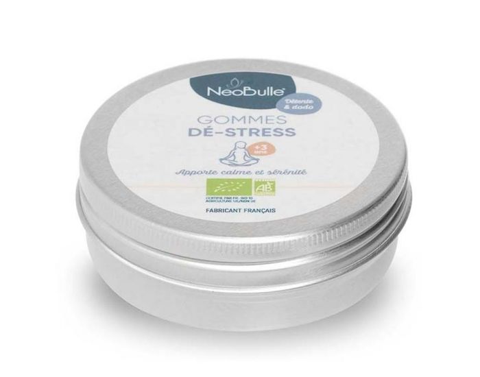 Gomme à sucer 100% Anti Stress !En cas de h2etit coup de mou, une gomme Dé-Stress et c'est reparti ! S'utilise de manière instantanée.Les gommes Dé-Stress Neobulle favorisent la détente, en cas de nervosité, d'anxiété et d'irritabilité. Grâce à un composé de 5 huiles essentielles BIO anti-stress : Orange-mandarine rouge-Bergamote, petit grain bigarade et Lavande, ces pastilles vous apporteront de l'apaisement dans les situations de tension.Bergamote : huile essentielle relaxante, facilite le sommeil chez l'enfantPetit grain bigarade: propriété calmante, relaxante et sédativeLavande : aide à gérer la nervosité et les tensionsMandarine rouge : pour calmer l'énervement et favoriser le retour de la joie de vivreOrange douce : aide à se recentrer et retrouver le calme, apporte une sensation de bien-êtreUtilisable à partir de 3 mois de grossesse ou à partir de 3 ans.Ingrédients issus de l'Agriculture BiologiqueFacile à emporter, pour toute la familleComposition :Miel*, gomme arabique*, huiles essentielles d'Orange*, Mandarine Rouge*, Bergamote, Petit grain bigarade* et lavande*. Agents d'enrobage : huile de tournesol* et cire de carnauba.*Ingrédients issus de l'agriculture BiologiqueContenance : Environ 40 gommes par boîteLa qualité des produits Néobulle :100% biologique.Naturels : sans composant de synthèse.Composition épurée et efficace : sans artifice .Les huiles essentielles sont choisies et dosées pour les plus fragiles.Testés pour les peaux sensibles (non testé sur les animaux). Fabricant :Néobulle (France)...