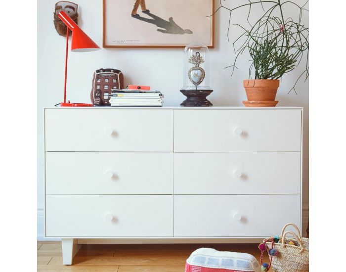 La commode Merlin 6 tiroirs peut faire office de grande table à langer, grâce au plan à langer XL Oeuf qui se fixe dessus très facilement. Gain de place assuré pour changer bébé et ranger toutes ses affaires !