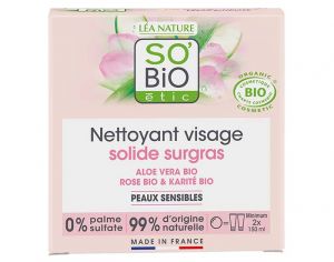 Le Nettoyant Visage Solide Surgras, Aloe vera Bio Équitable, Peaux Sensibles So'Bio Étic nettoie la peau tout en douceur, sans l'assécher. Formulé avec de l’Aloe vera bio équitable et du Beurre de Karité bio équitable protecteurs, et de la Rose bio reconnue apaisante.