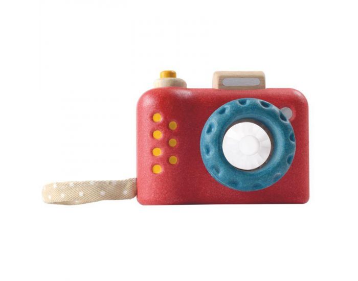 Votre enfant fera semblant de prendre des photos. Un adorable appareil photo en bois avec dragonne de la marque Plan Toys - réf. PT5633.