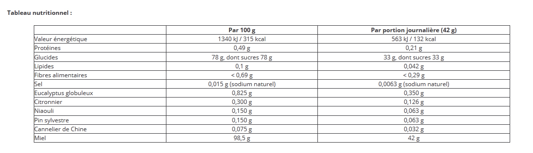Miel* (98.5%), huiles essentielles 100% biologiques*: Eucalyptus globuleux,0.825%, Citronnier 0,3%, Niaouli 0,15%, Pin sylvestre, Cannelier de Chine 0,075%.