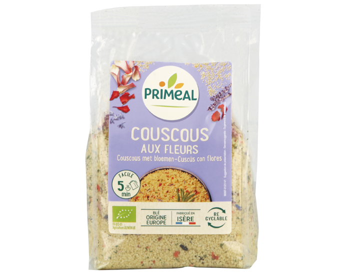 Semoule blanche de BLE dur*, flocons de pois chiche*, sel marin, carotte*, fleurs* (1%)(hibiscus*, rose*, bleuet, lavande*), paillettes d’huiles essentielles* (agave*, huilesessentielles d’agrumes*), oignon*, persil*, ail des ours*, ail*, romarin*, curcuma*.