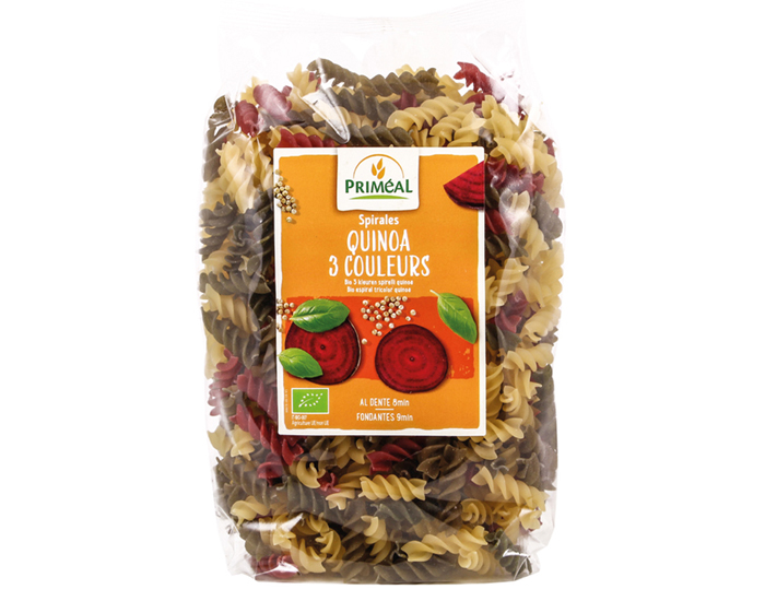 Les Spirales 3 Couleurs au Blé et Quinoa Priméal sont des pâtes composées de céréales de blé dur et de quinoa.