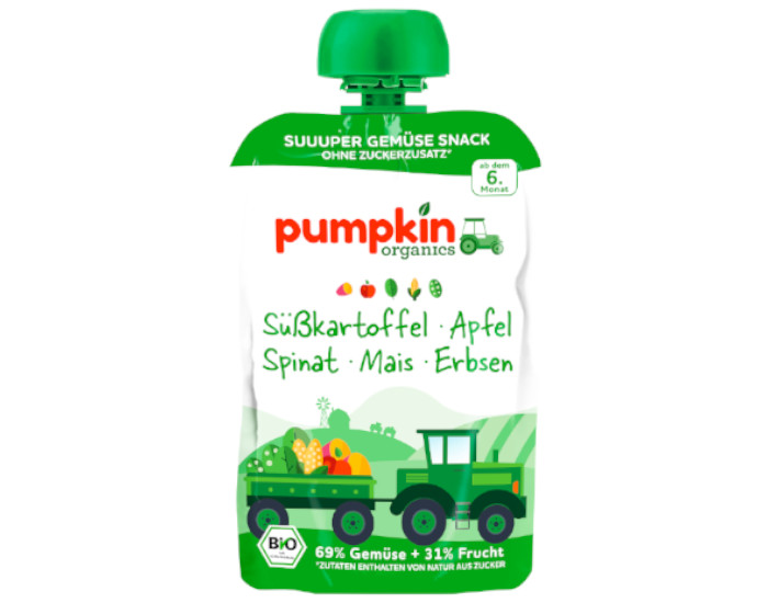 Découvrez de nouvelles saveurs, textures et goûts avec la Gourde Patate Douce, Épinards, Maïs, Petit-Pois, Pomme Pumpkin Organics.