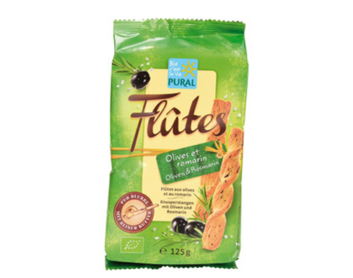 Les Flûtes Olives et Romarin Pural sont fabriquées à partir de pur beurre et de farine de blé, et aromatisées avec des petits morceaux d’olives noires et du romarin séché.