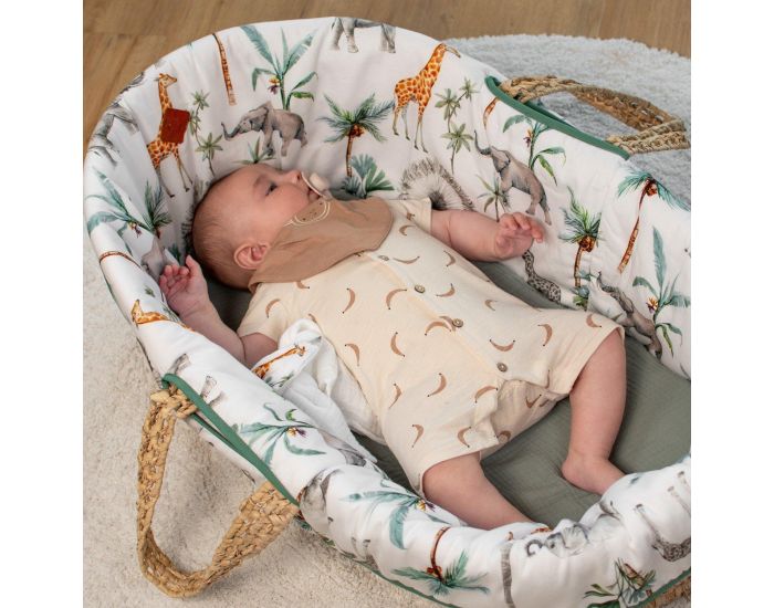 Découvrez le set complet de couffin bébé de la Collection Safari par Sevira Kids. Ce panier moïse en fibres naturelles de palmier inclut tout le nécessaire : matelas, habillage en satin de coton avec des motifs savane, et drap housse en gaze de coton fabriqués en France.