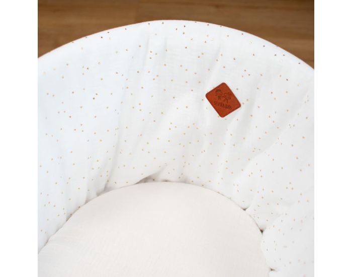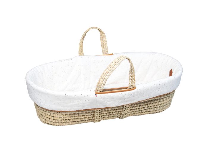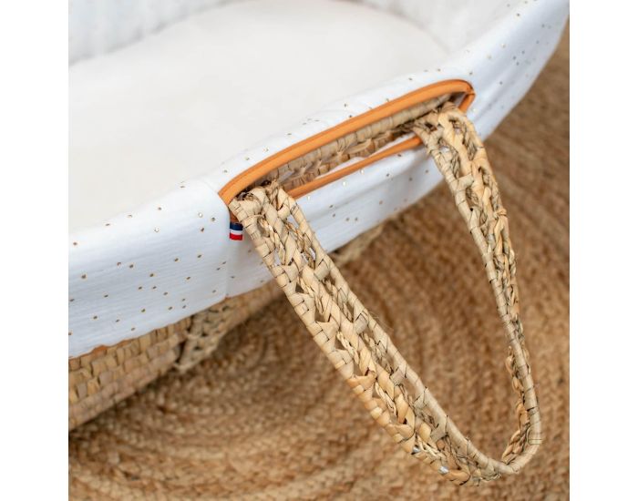 Découvrez le set complet de couffin bébé de la Collection Jeanne par Sevira Kids, avec des motifs élégants de pois dorés sur la gaze de coton. Ce panier moïse, réalisé en fibres naturelles de palmier, inclut tout le nécessaire pour accueillir votre bébé avec style : matelas, habillage en gaze de coton ornée de glitter, et drap housse assorti. Fabriqué en France, ce couffin allie sécurité et confort pour offrir à votre enfant un espace douillet dès ses premiers jours.