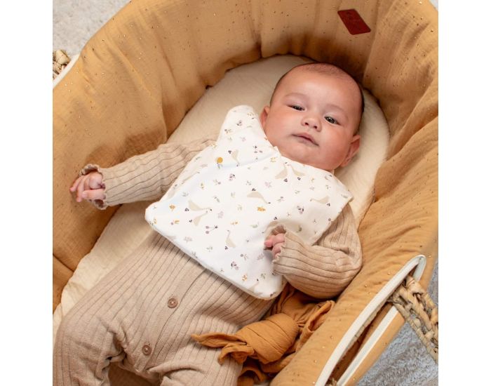 La Collection Jeanne se distingue par son linge de lit en gaze de coton avec pois dorés, certifié Oeko-Tex et REACH, garantissant une douceur supérieure et un environnement sain pour les peaux sensibles. Conçu dans un atelier français, ce couffin combine artisanat traditionnel et matériaux durables. Complétez l'ensemble avec la gigoteuse et la couverture assorties pour un confort optimal.