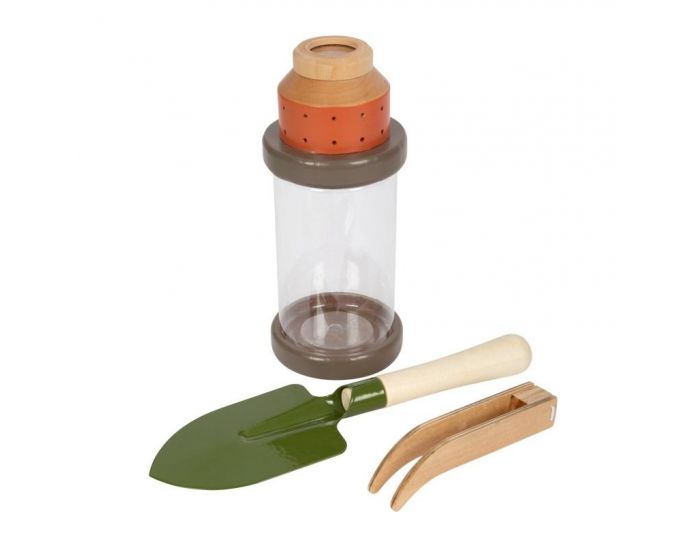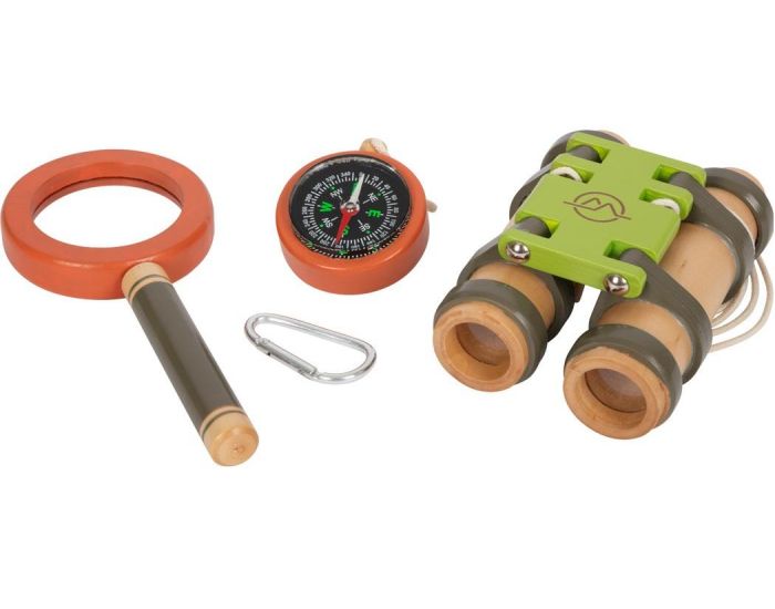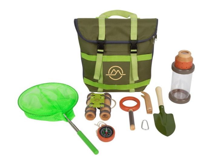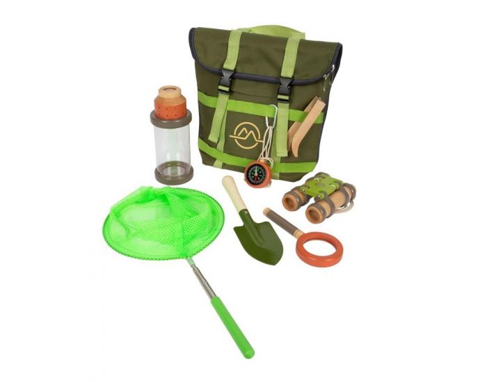 Le sac à dos contient tout l’équipement de l’explorateur : gobelet d’observation à insectes vissable avec loupe intégrée, jumelles en bois, filet à papillons/épuisette avec bras télescopique, boussole avec sangle, loupe avec fonction de grossissement ainsi que pince, pelle et mousqueton.