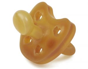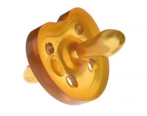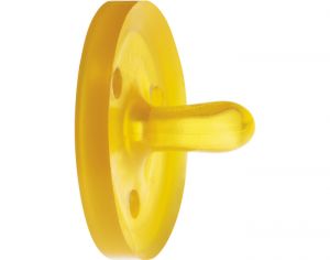 Tétine physiologique en caoutchouc 100% Naturel HEVEA pour les besoins de succion de bébé. L'embout de la tétine est ventilé, pour limiter au maximum les impacts sur la future dentition.