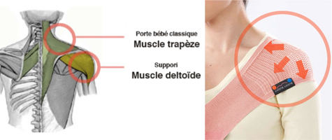 SUPPORi supporte le poids du bébé avec le muscle deltoïde. Ce muscle est très fort et permet de vous sentir plus à l'aise pour porter le poids du bébé pendant de longues périodes. En outre, la structure de tricot peut s'étirer parfaitement sur votre épaule et rester bien en place.