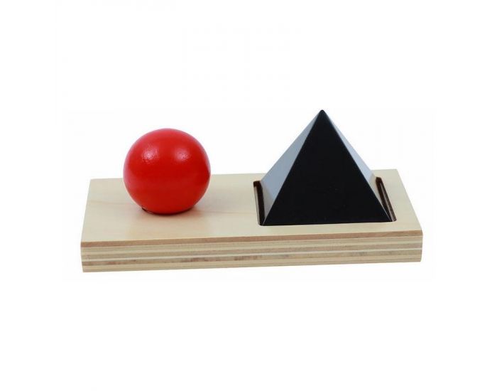 Ensemble de 2 solides représentant les symboles d'introduction à la grammaire (nom et verbe) rangé dans un plateau en bois.
