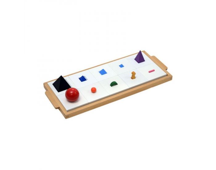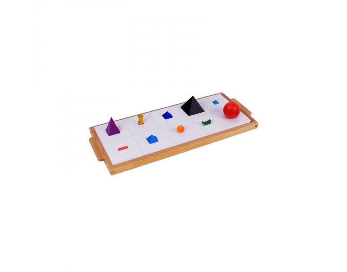 Ensemble de 10 solides représentant les symboles de grammaire en bois, rangés sur un plateau en bois.