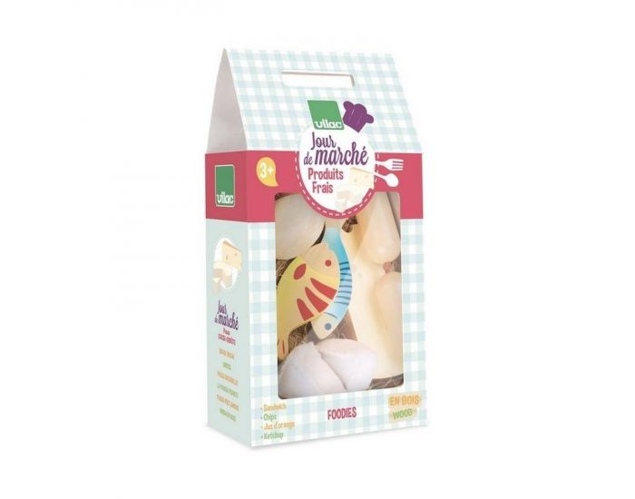 Vous avez ramené dans votre jolie caissette en carton deux poissons, du jambon, un chapelet de saucisse, un oeuf, une brique de lait, un camembert et un morceau de comté.