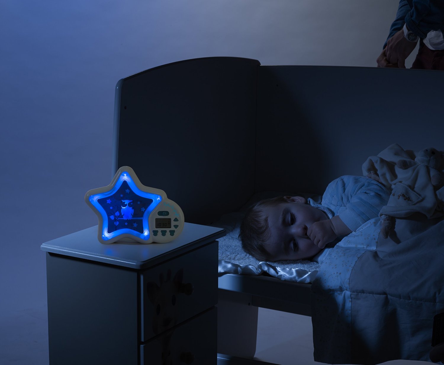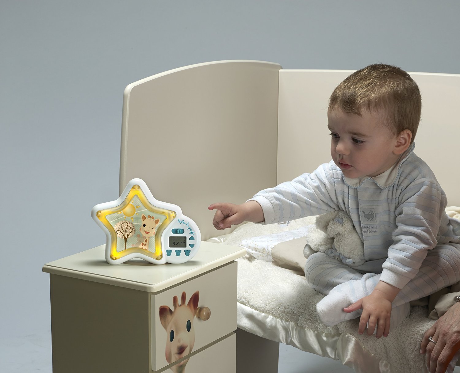 Une lumière bleutée et l'image d'un hibou apparaissent sur l'écran lorsqu'il est l'heure de dormir, puis se change en lumière jaune, avec une image de Sophie la Girafe lorsque l'enfant peut se lever.