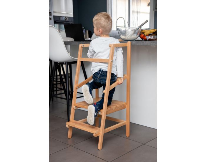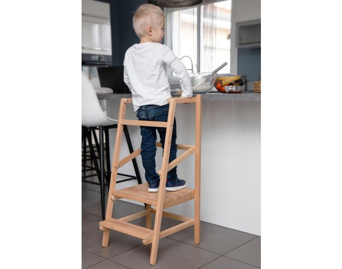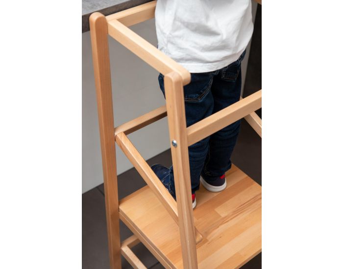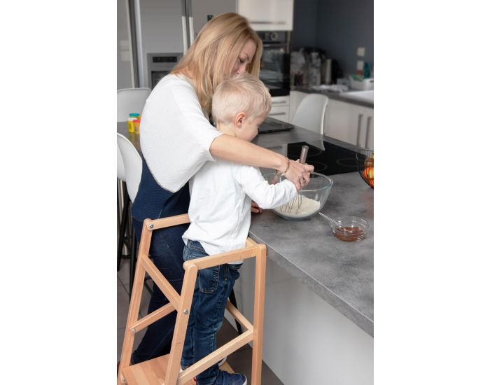 Avec sa petite marche d'accès et ses côtés protégés, elle garantit une parfaite sécurité et une position adaptée pour expérimenter les activités de la cuisine ou de la salle de bain à côté d'un adulte.